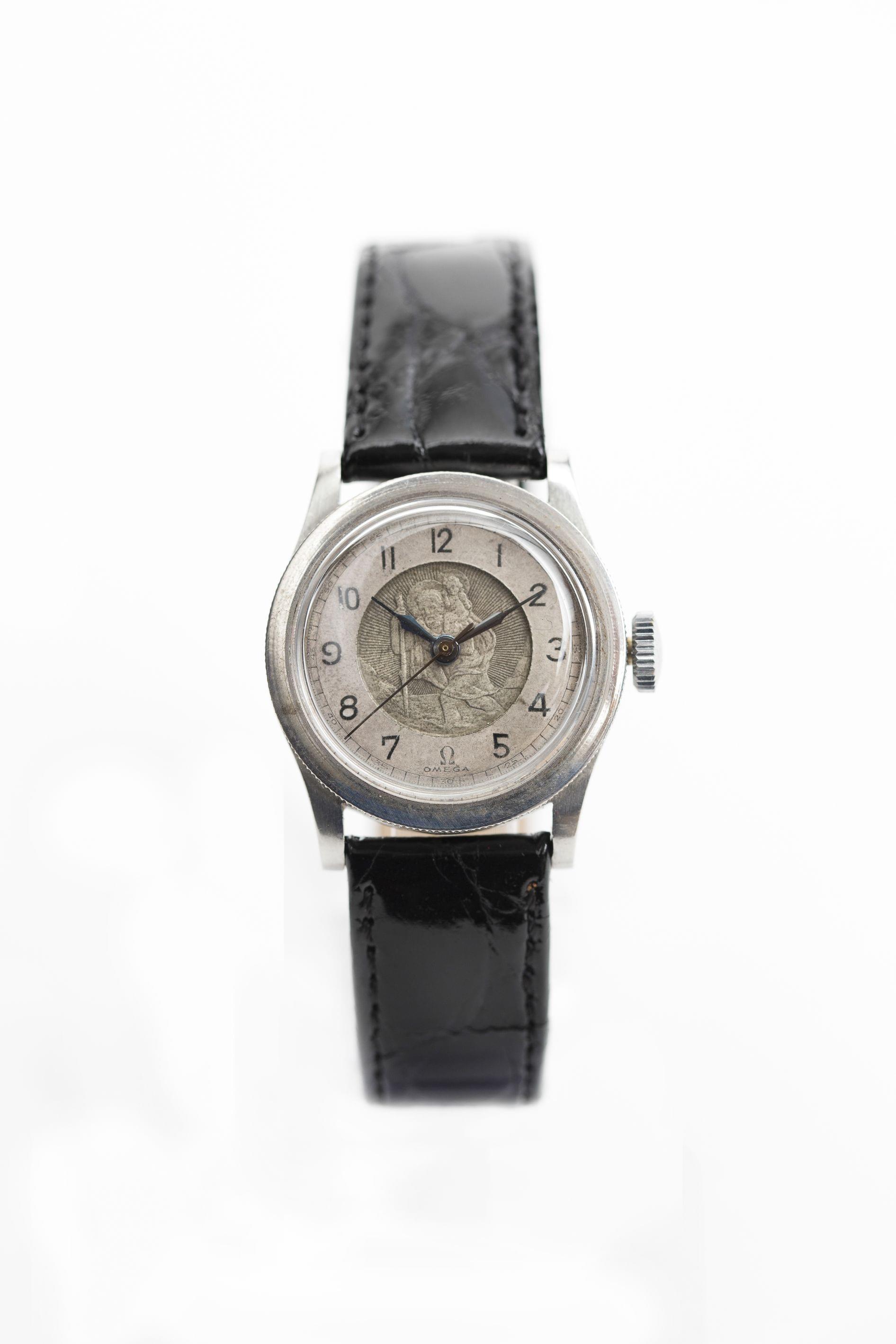 Cadran argenté à décor de saint Christophe, chiffres arabes noirs, réf. CK2041, 1938, acier, D 28 mm, dans un écrin