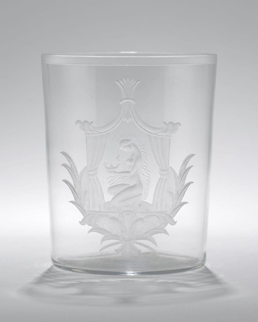 Gobelet, verre translucide à décor gravé d'une vestale tenant une lampe à huile, signé "Orrefors G 237 1927 JL", Exposé au Musée Ariana 2012, H 12 cm
