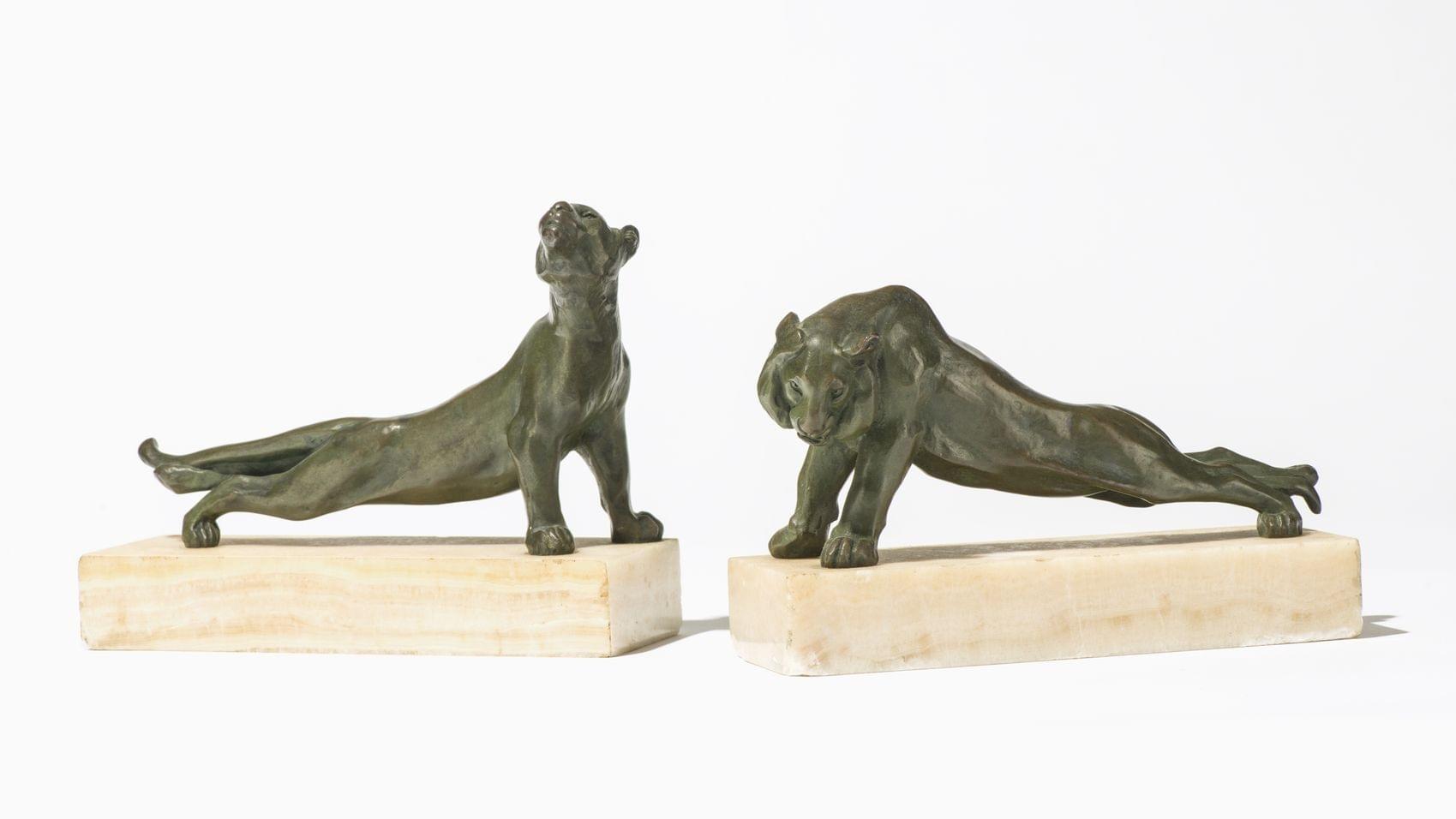 Lion et lionne, deux bronzes à patine verte sur base en onyx, signés, H 15 cm