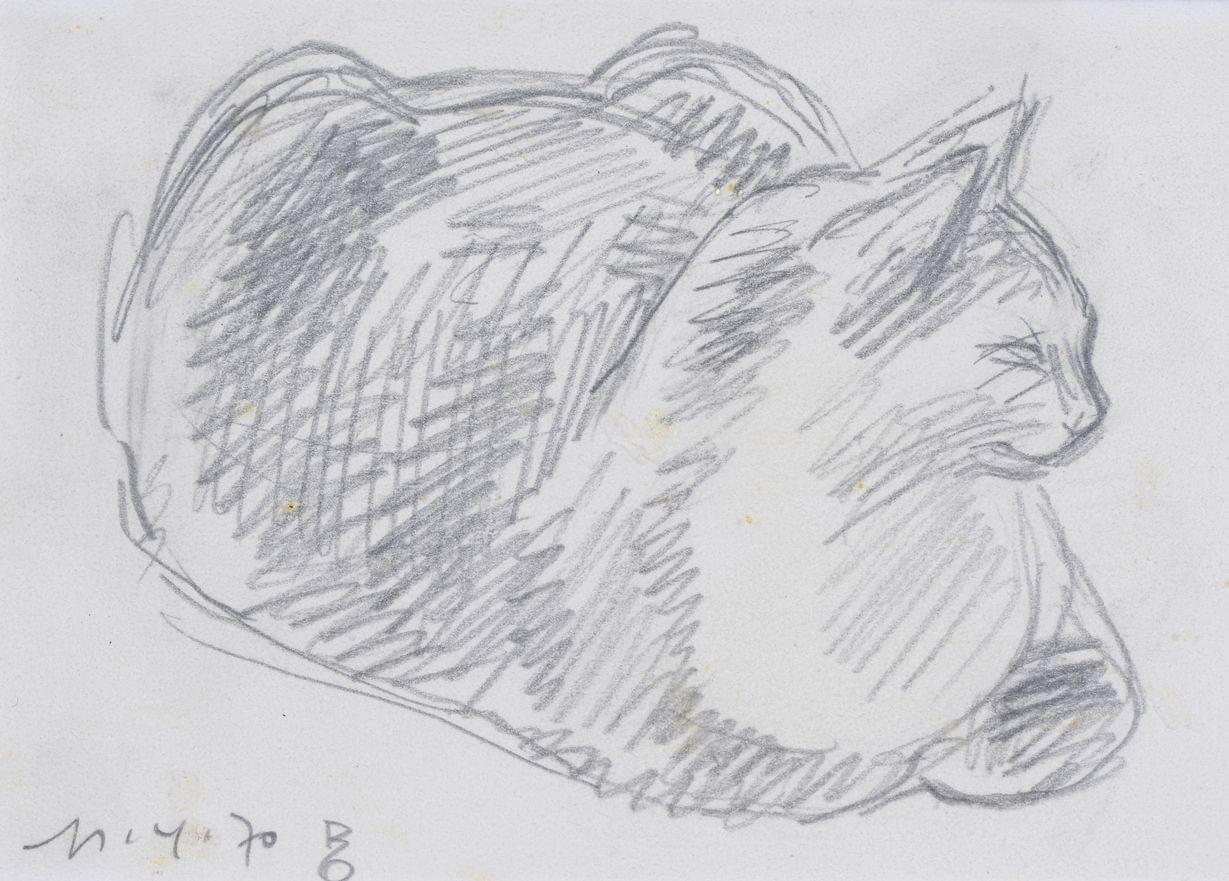 Liegende Katze, mine de plomb sur papier signée, D 23 cm