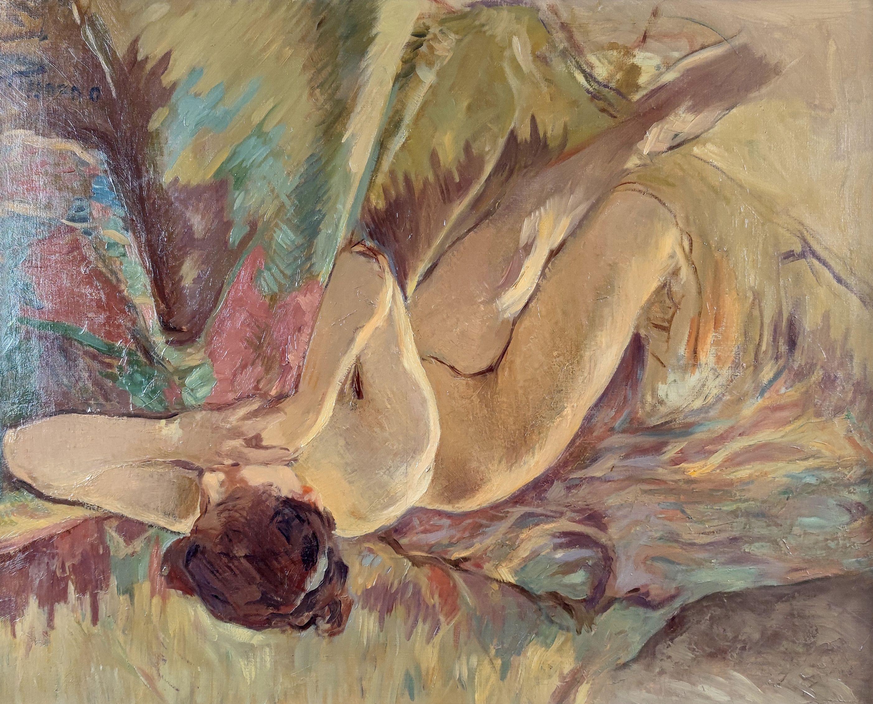 Femme assise, un sein dénudé, huile sur toile, signée, 63x52 cm