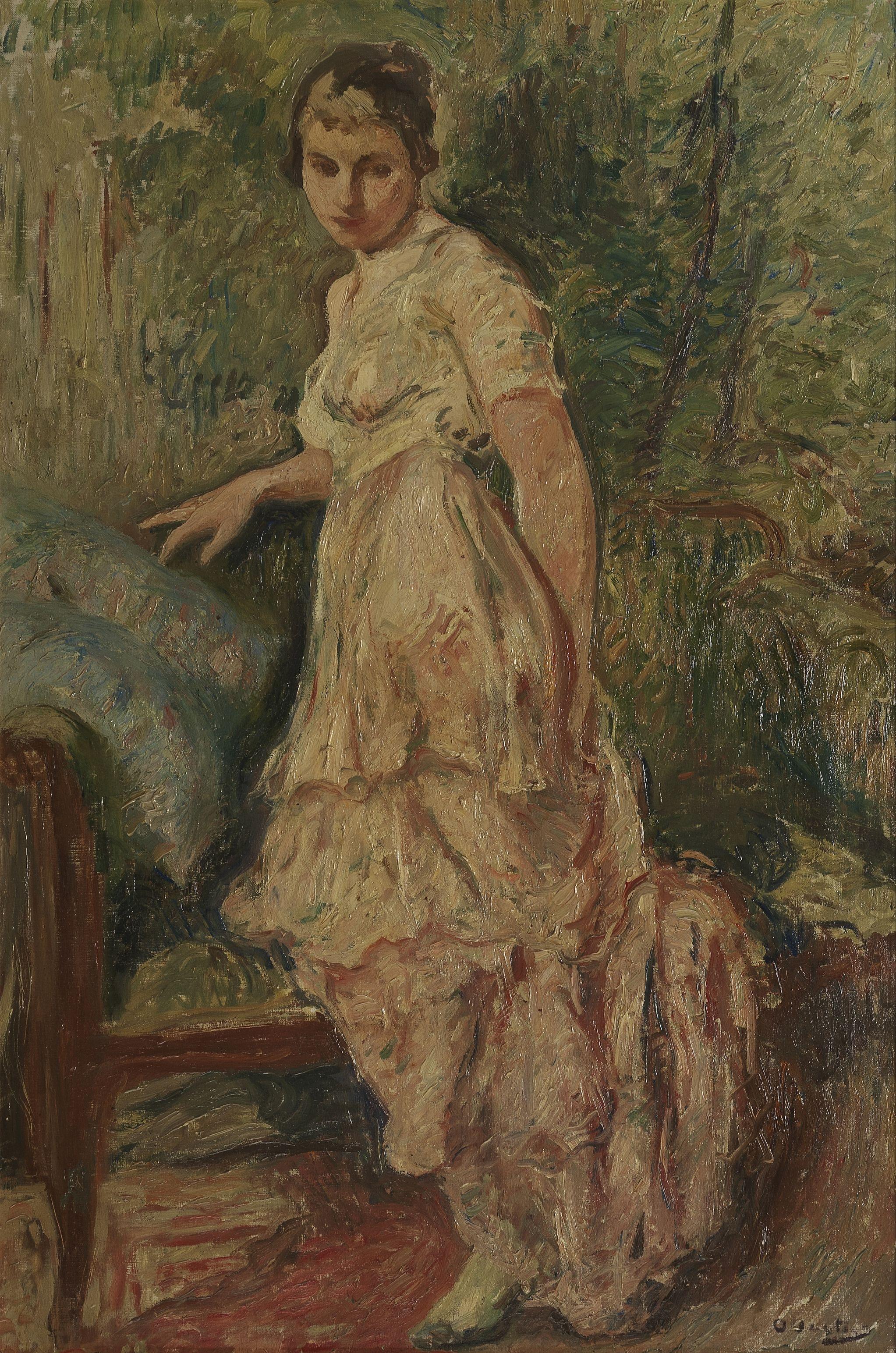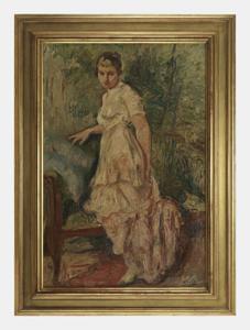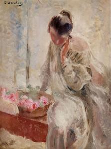 Femme au panier de roses, huile sur toile, signée, 60x46 cm