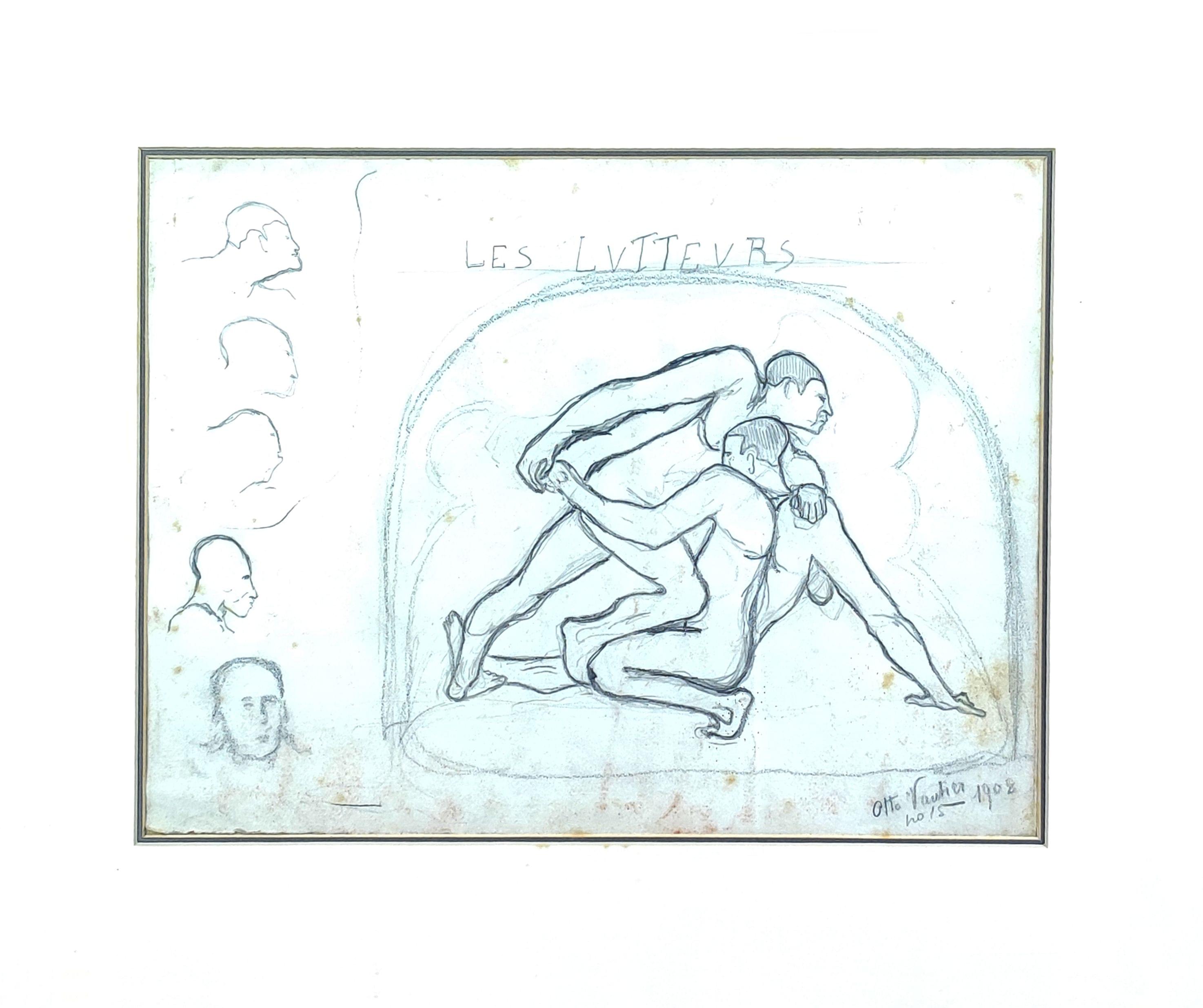 Les lutteurs, mine de plomb sur papier signée et datée 1908, 24x32 cm