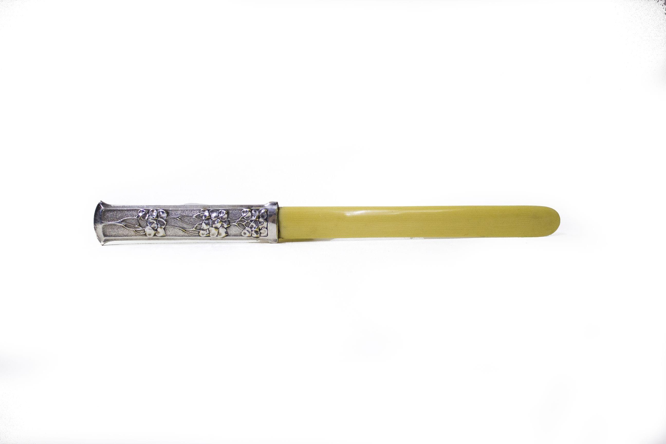 Manche décoré de feuillages, métal argenté et ivoire, L 27 cm