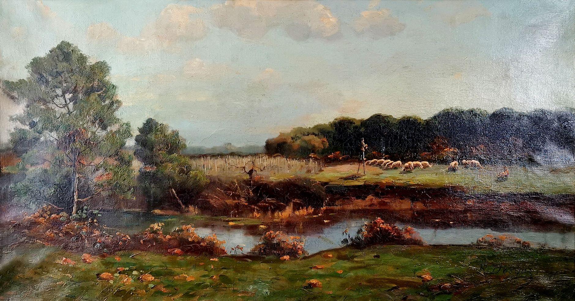 Berger des Landes près de la mare, huile sur toile, signée, 35x65 cm