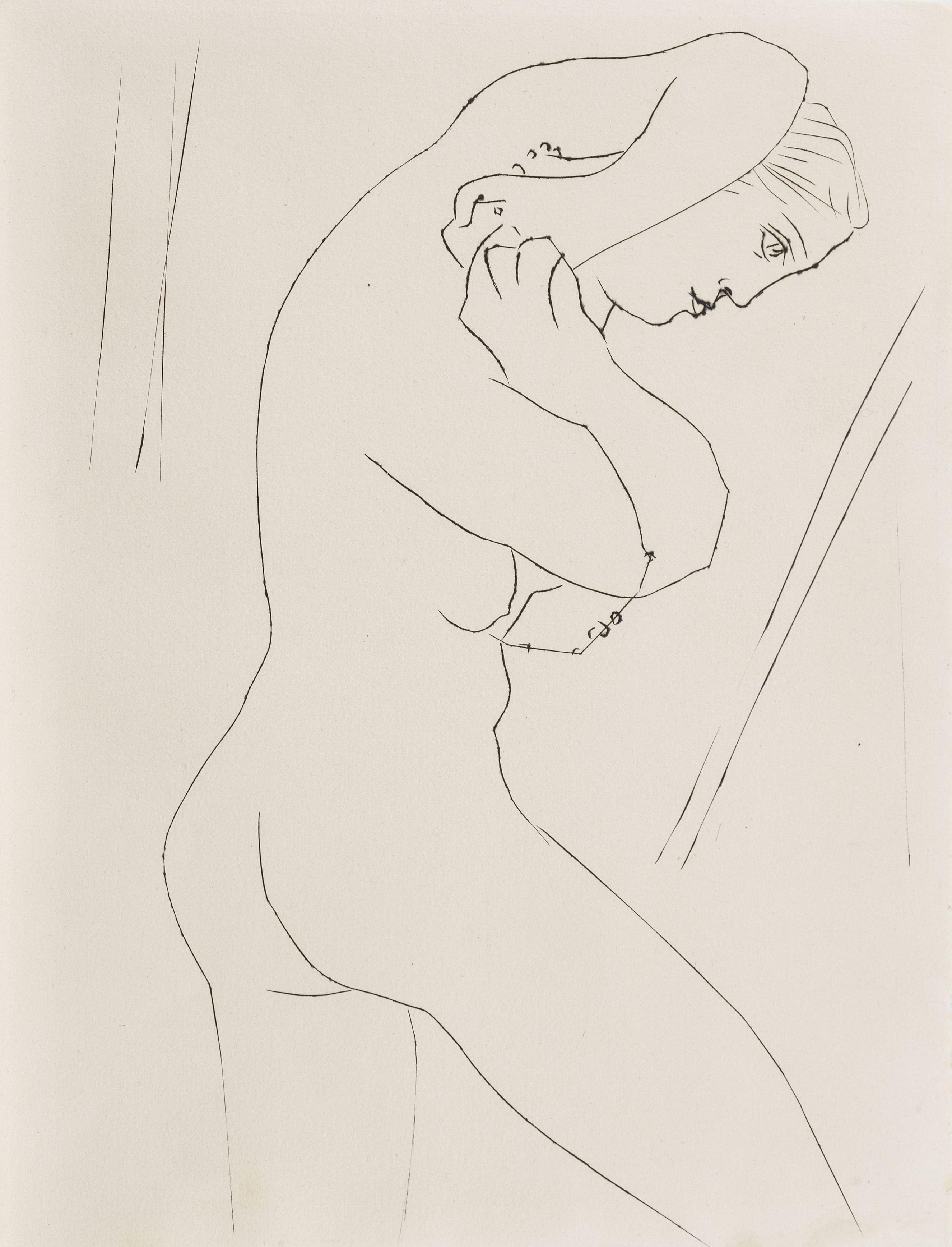 L'aiguille des secondes, gravure au burin, non signée et non datée, 33,5x25,5 cm. Planche issue de six gravures par Picasso des Contes fantasques par Maurice Toesca, imprimée par l'atelier Lacourière et éditée par Flammarion à Paris en 1953. Tirée à 225 ex. Bloch 365