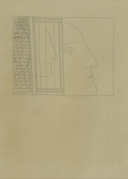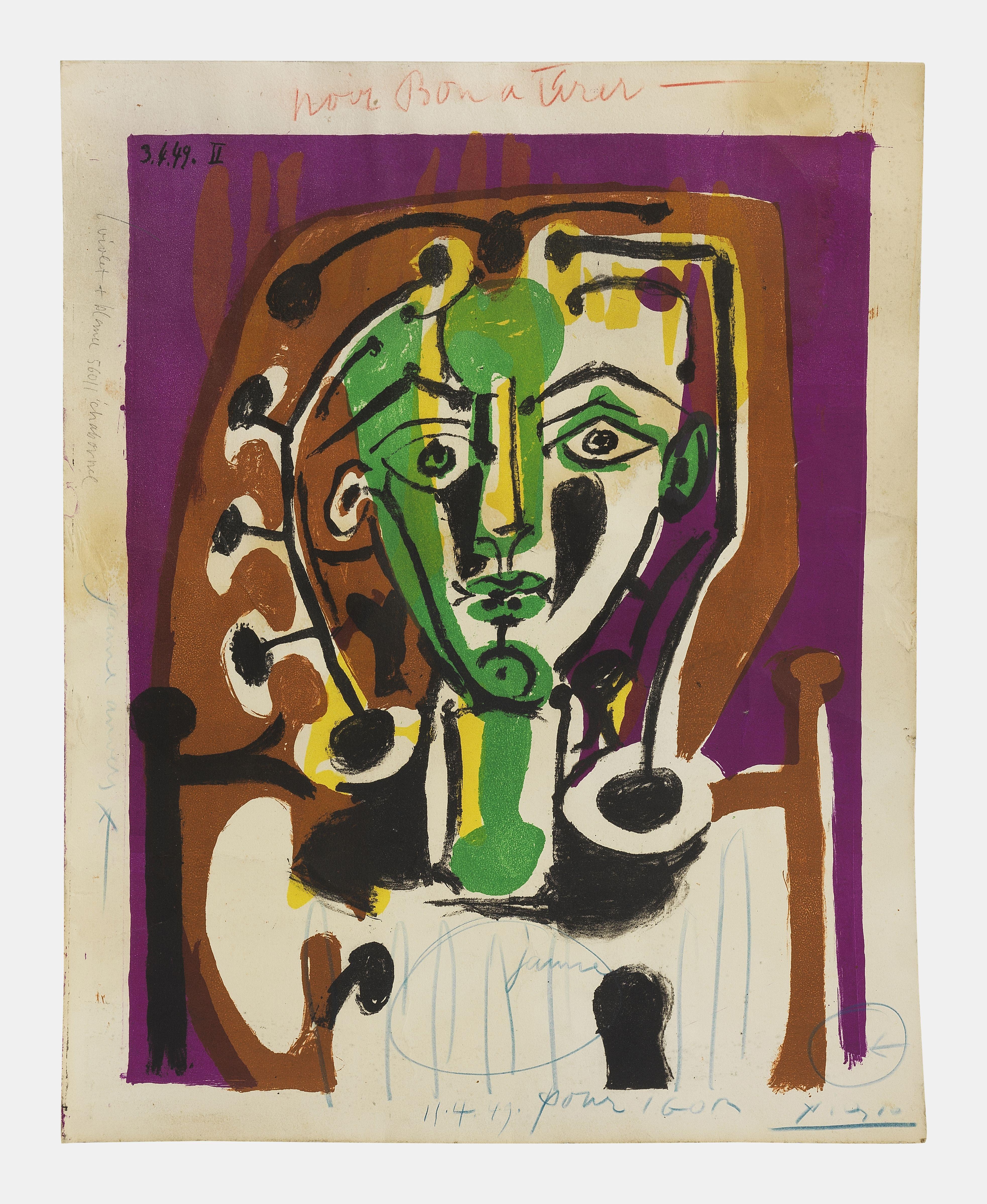 Figure au corsage rayé (3 avril 1949), lithographie en cinq couleurs sur vélin portant de nombreuses indications manuscrites au crayon à papier, crayon de couleur rouge et bleu. Contredaté 11-4-49, dédicacé pour Igor et contresigné par Picasso au crayon bleu, 59x46 cm. Intéressante épreuve dont la comparaison avec la lithographie finale permet de mettre en exergue le processus créatif de l'artiste (violet à éclaircir, rayures jaunes et rouges qui seront rajoutées, etc.)