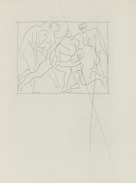 Lutteurs, gravure sur cuivre rayé, 34x26 cm