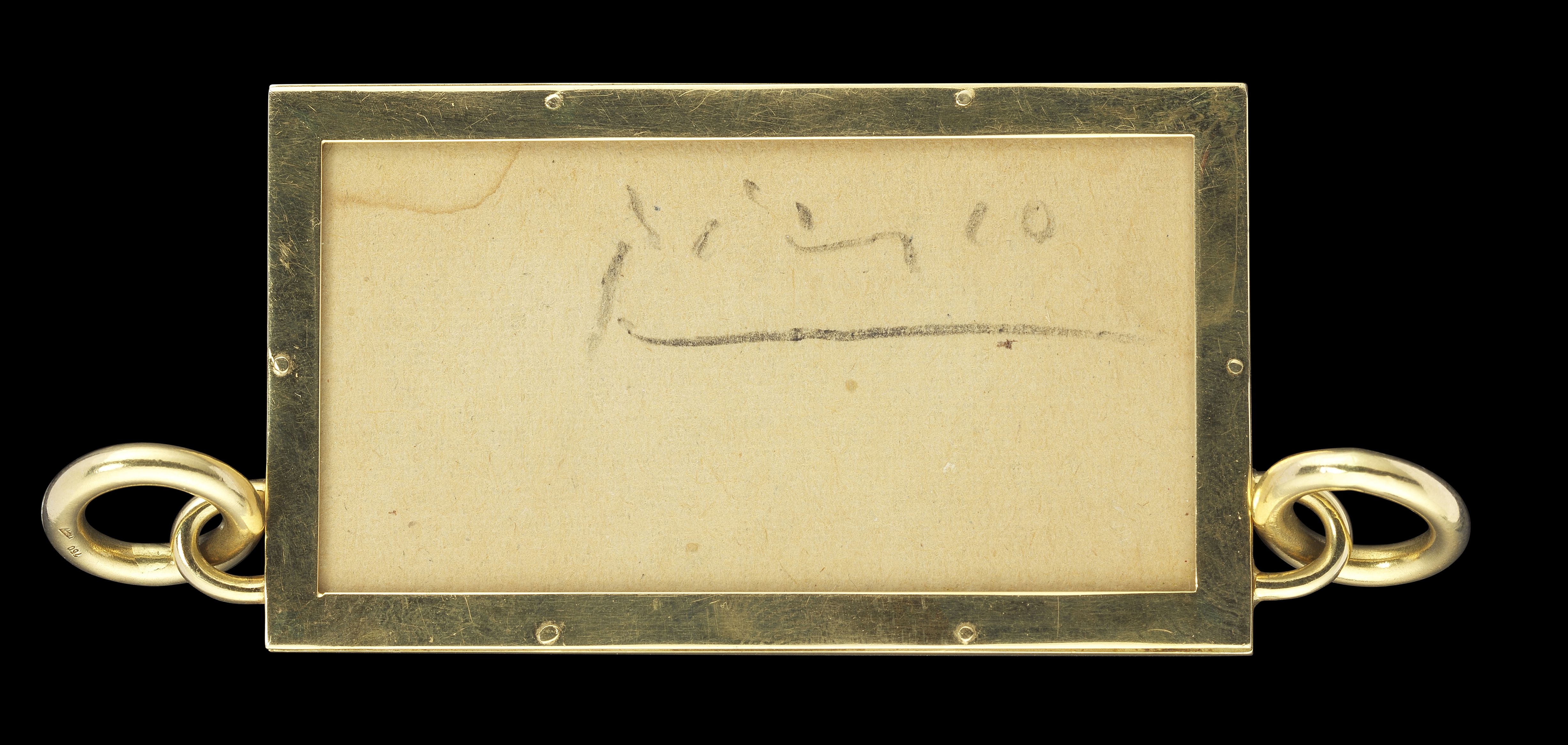 La sirène, été 1952, crayon graphite sur papier, signée au dos, 6,2x3,2 cm. Un certificat du Comité Picasso en date du 15 mai 2025 accompagne cette oeuvre. Le montage en or 750 en bijou n'est pas de Picasso, poids brut 45 g.