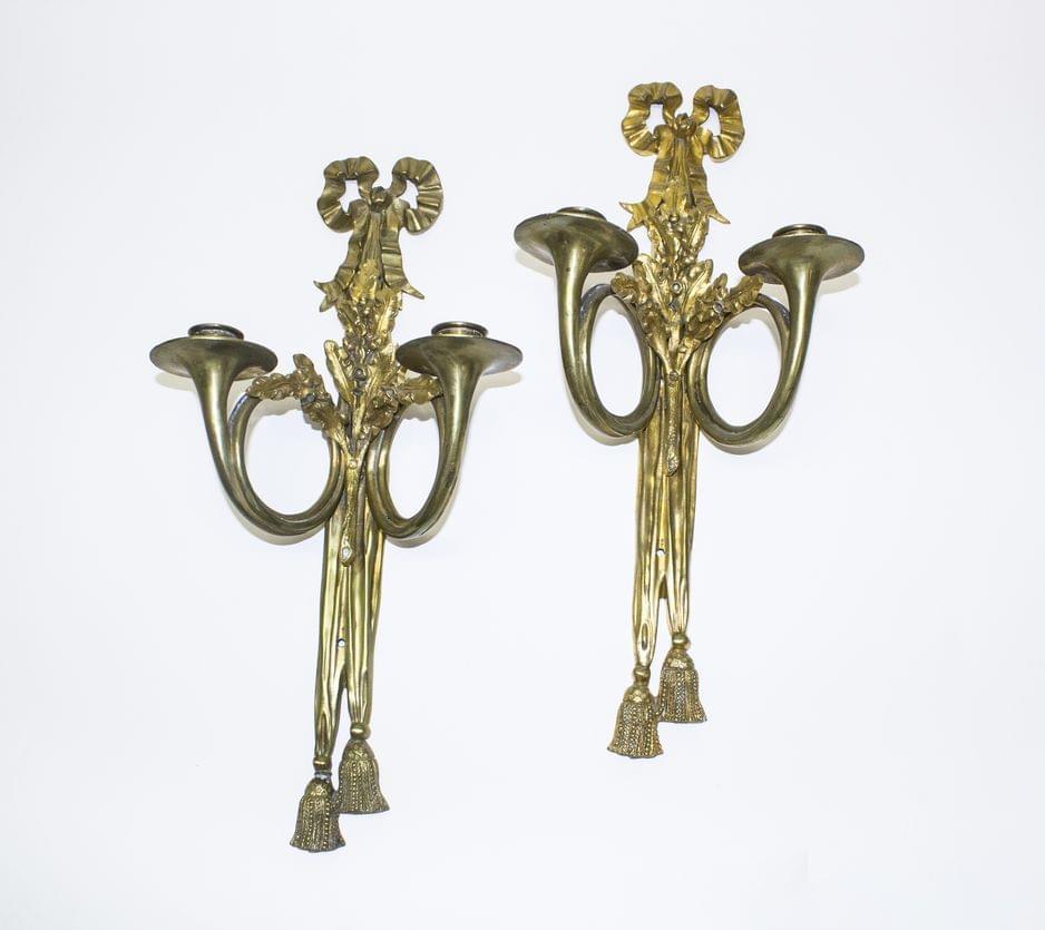 Formées de cors de chasse réunis par un ruban, bronze doré, H 41 cm