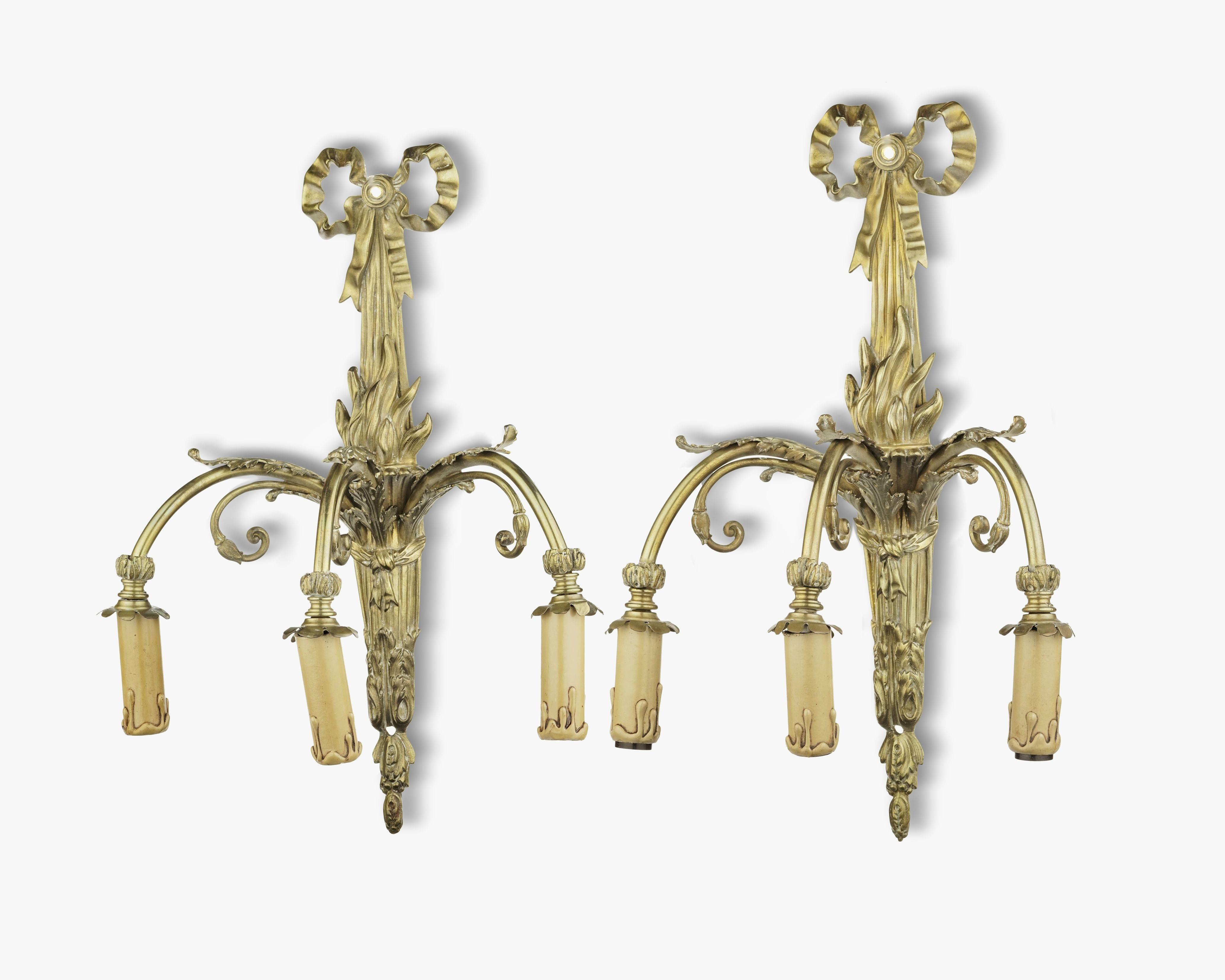 Bronze doré, H 44 cm. Provenance: Selon la tradition ces appliques proviendraient du Grand Théâtre de Genève et ont été décrochées après l'incendie de 1951.