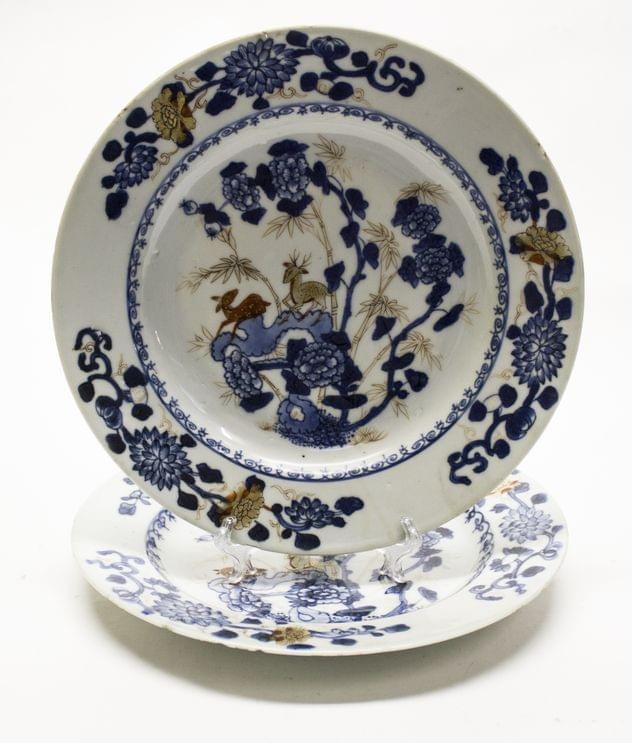 Porcelaine émaillée bleu rouge et or à décor de cervidés et de fleurs, Chine, XVIIIe s, D 23 cm