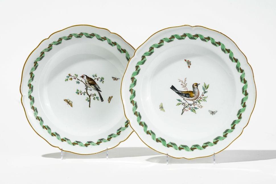 361. Paire d'assiettes à décor d'oiseau et papillon, marli orné d'un ruban vert