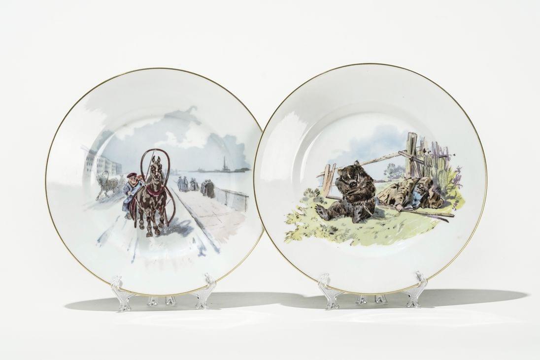 148. Paire d'assiettes à décor d'un dresseur d'ours et d'une troïka