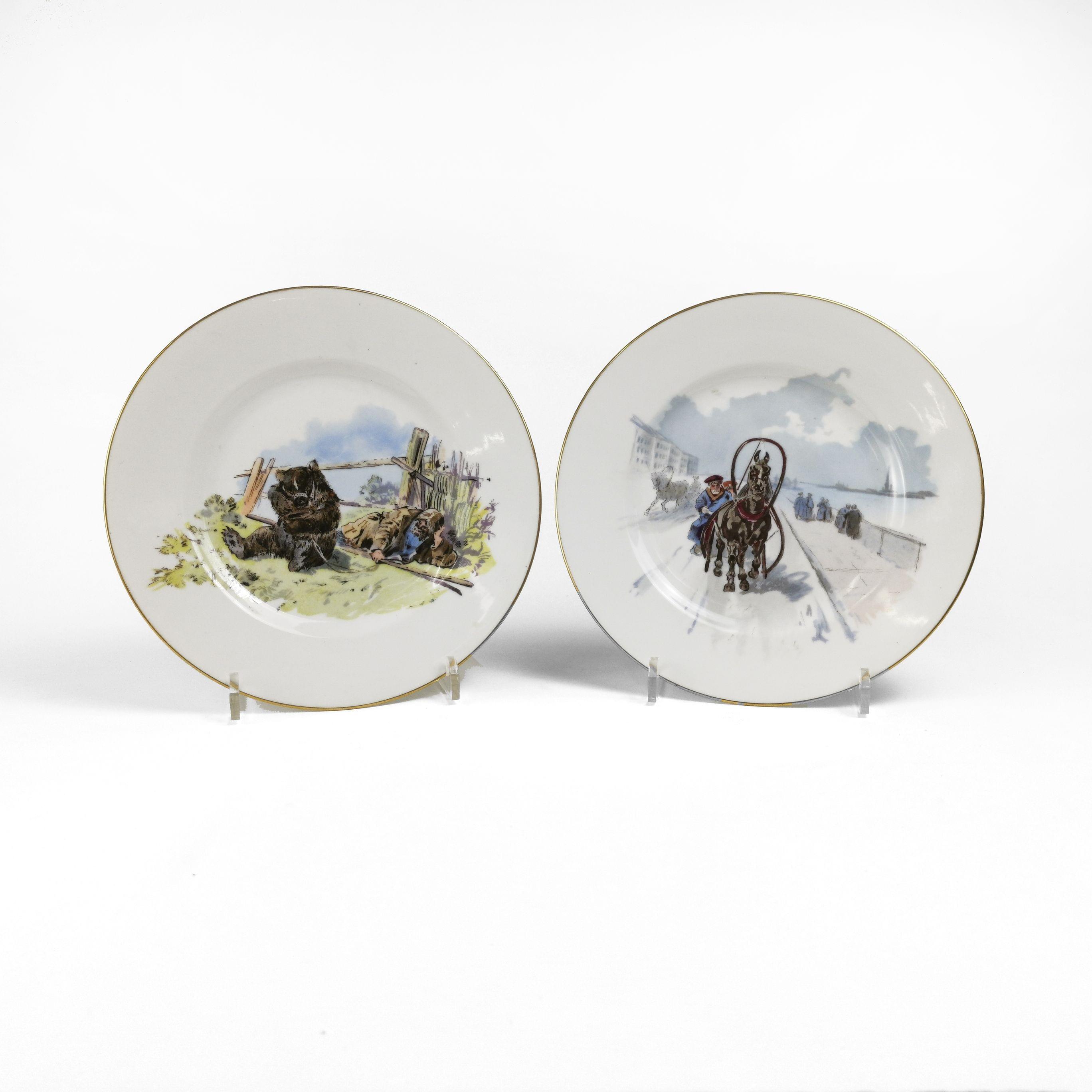 4361. Paire d'assiettes à décor d'un dresseur d'ours et d'une troïka