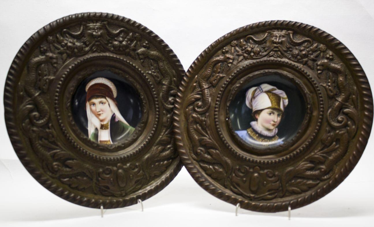 Cuivre repoussé et plaque de porcelaine émaillée polychrome à décor de personnages en costume, D 30 cm