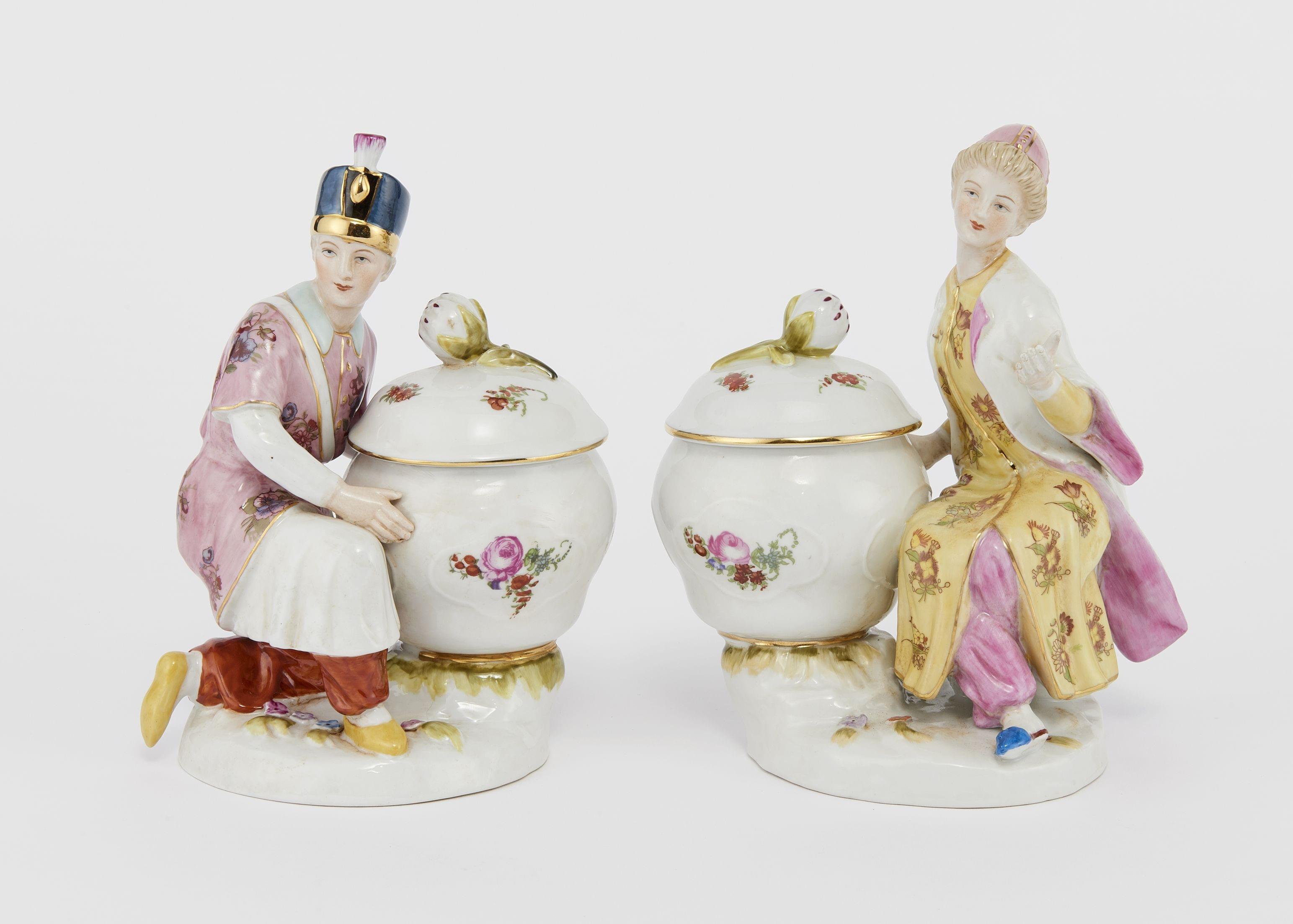 383. Paire de boîtes flanquées d'une figurine de jeune homme en costume oriental