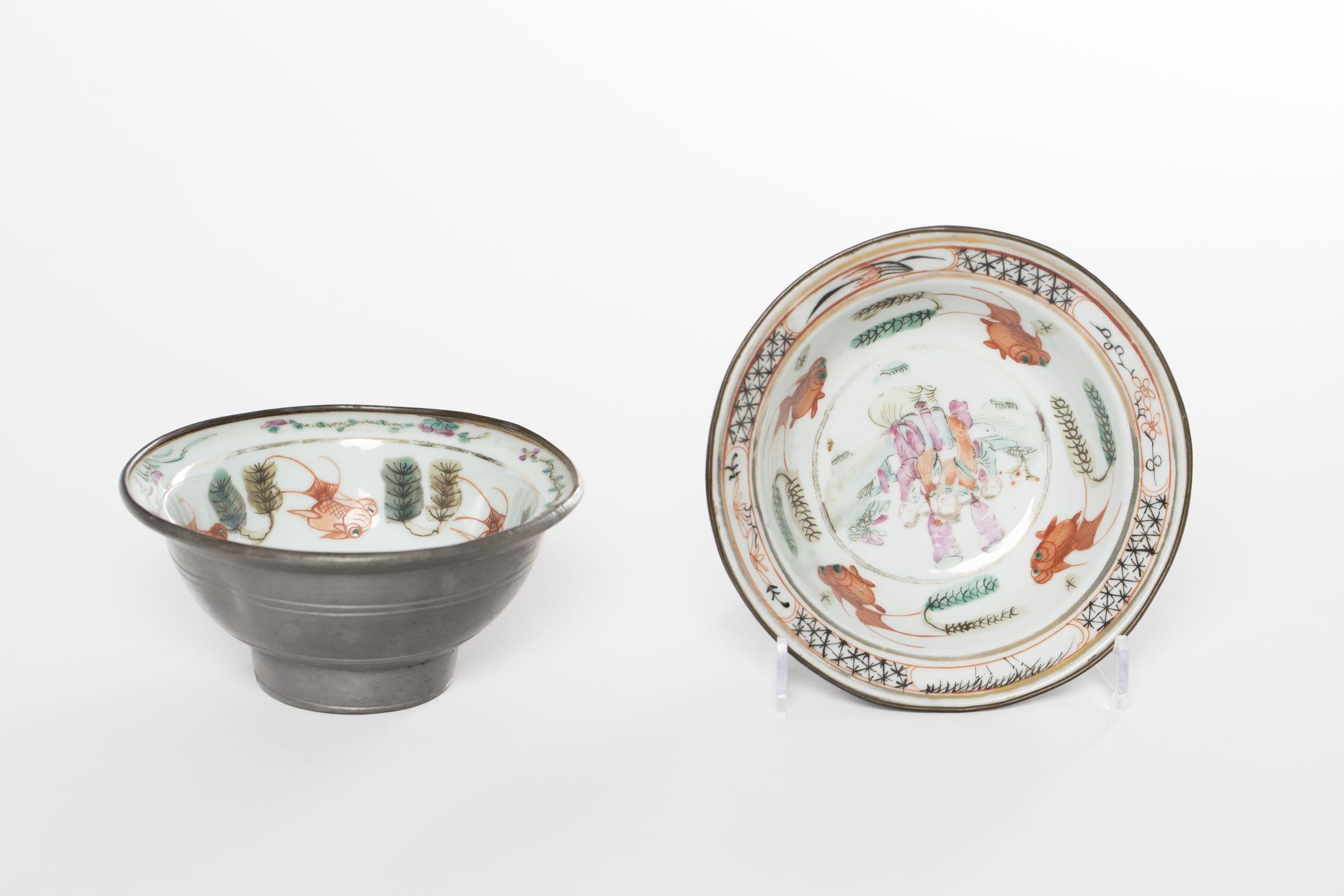 Porcelaine émaillée polychrome à décor de personnages et poissons, doublure en étain, D 12,5 cm