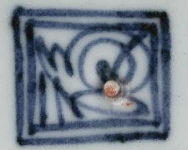 Porcelaine émaillée bleu, rouge et or à décor d'un paysage polychrome, marque Fuku, D 21 cm