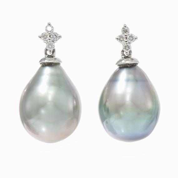 305. Paire de boucles d'oreilles retenant des perles de Tahiti surmontées de diamants