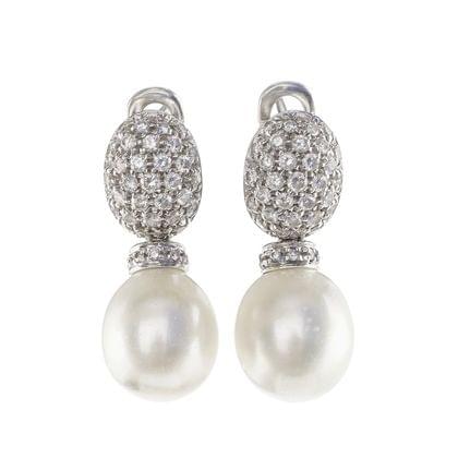 285. Paire de boucles d'oreilles retenant des perles rehaussées d'un pavage de diamants (env. 0.9 ct)