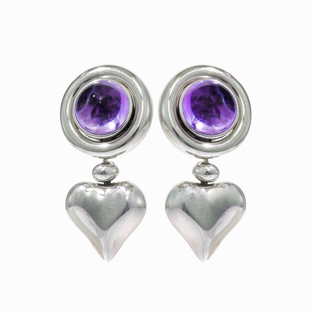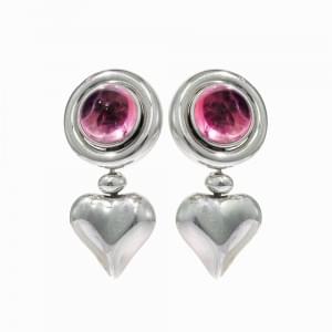 312. Paire de boucles d'oreilles serties de cabochons interchangeables de topaze bleue, améthystes et tourmalines roses retenant un pendentif cœur