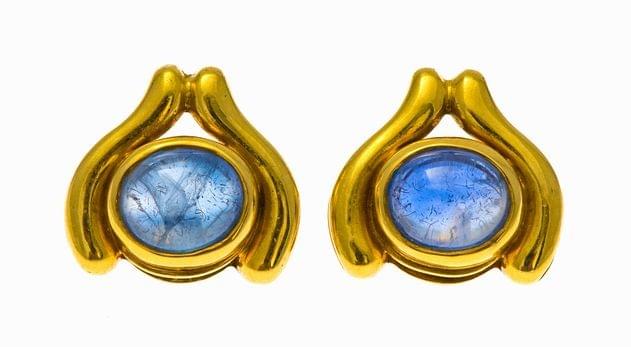 3076. Paire de boucles d'oreilles serties de saphirs cabochon