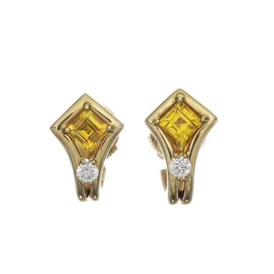 243. Paire de boucles d'oreilles serties de saphirs jaunes taille princesse surmontant un diamant