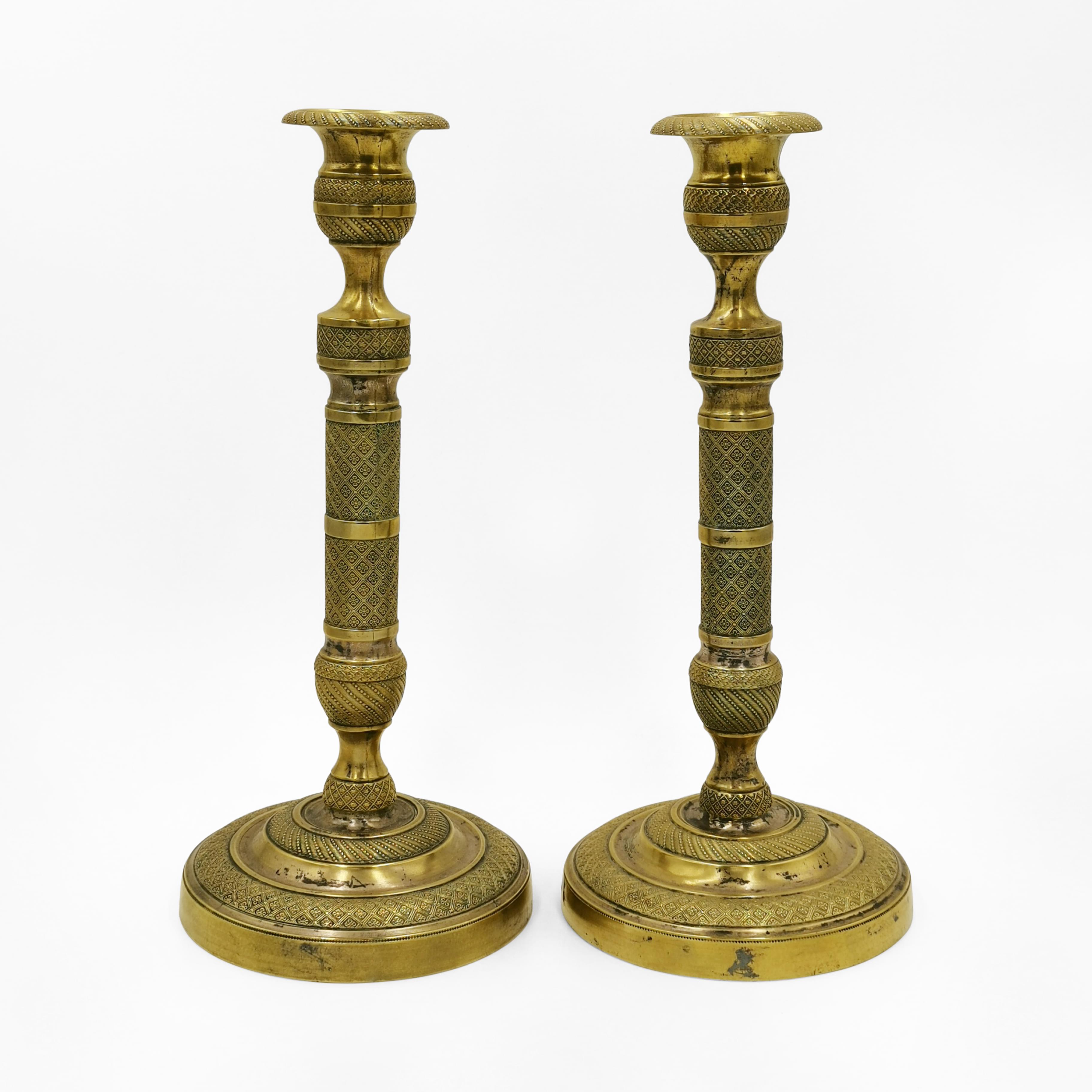 1. Paire de flambeaux à décor repoussé de larges fleurs et acanthes