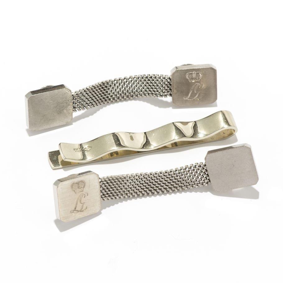 3098. Paire de boutons de manchette monogrammée LG couronné. On joint une pince à cravate
