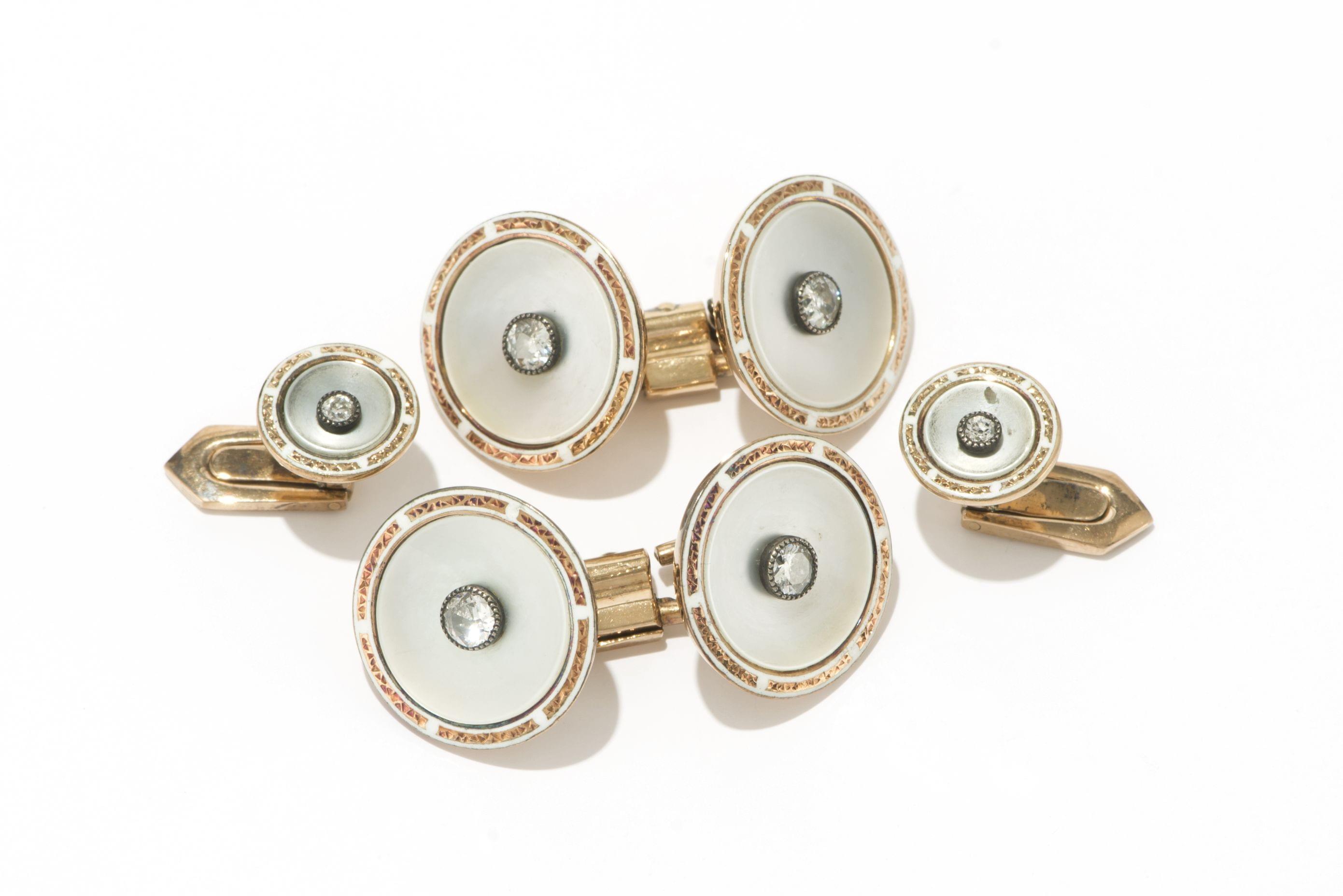 On joint deux boutons de plastrons du même modèle, or 585, nacre et émail, 12 g