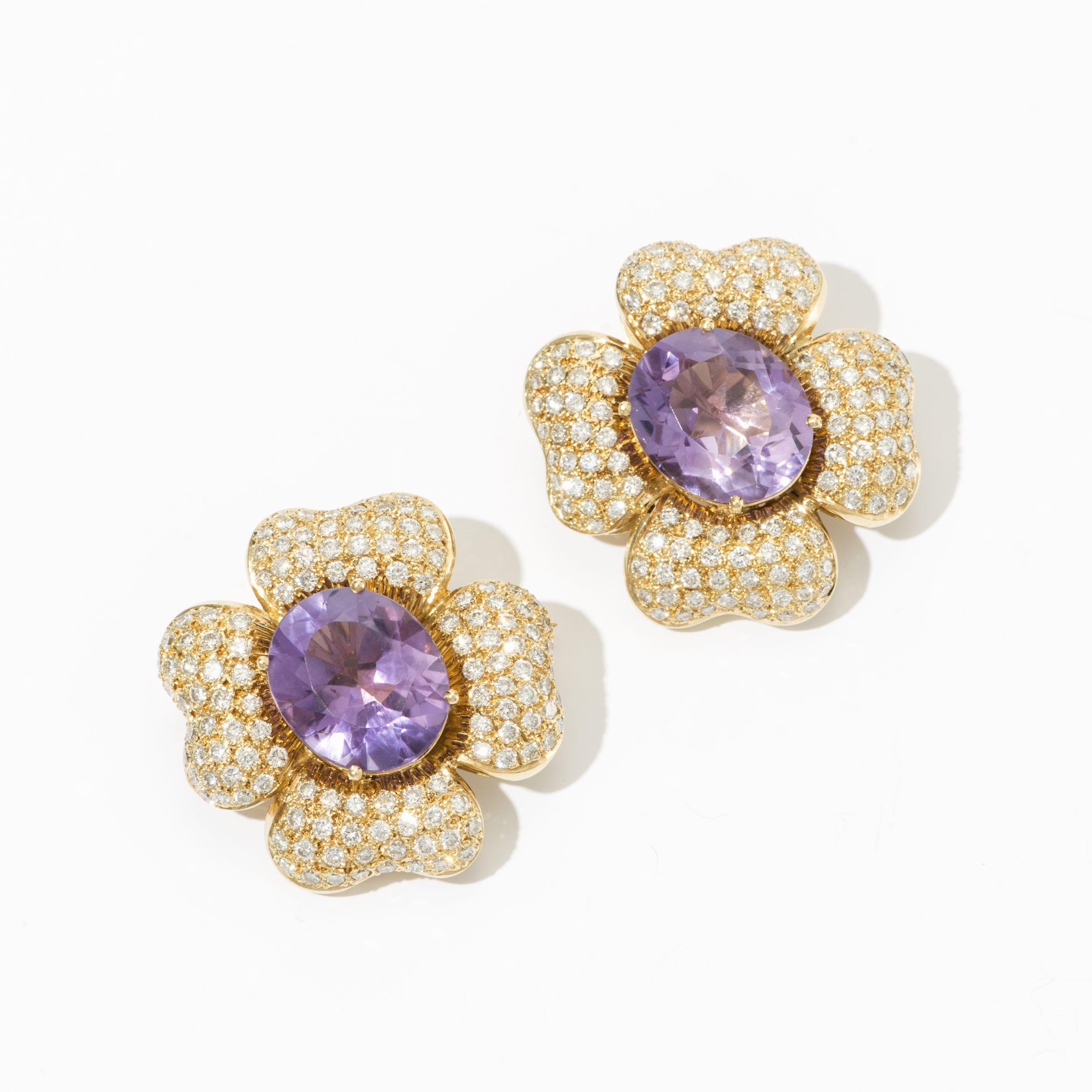 77. Paire de broches fleurs pavées de diamants et serties d'améthystes