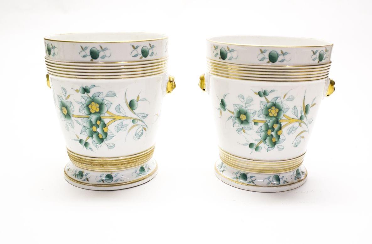 3257. Paire de cache-pots à décor vert et or de fleurs japonisantes