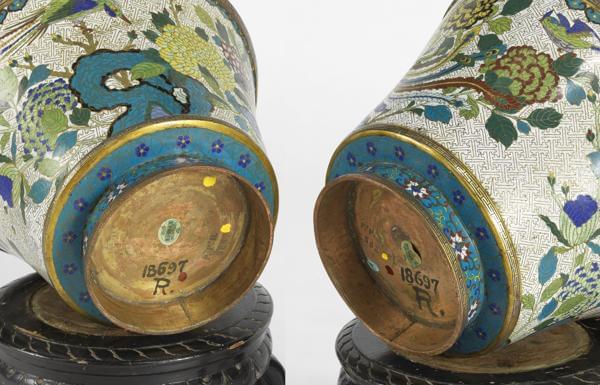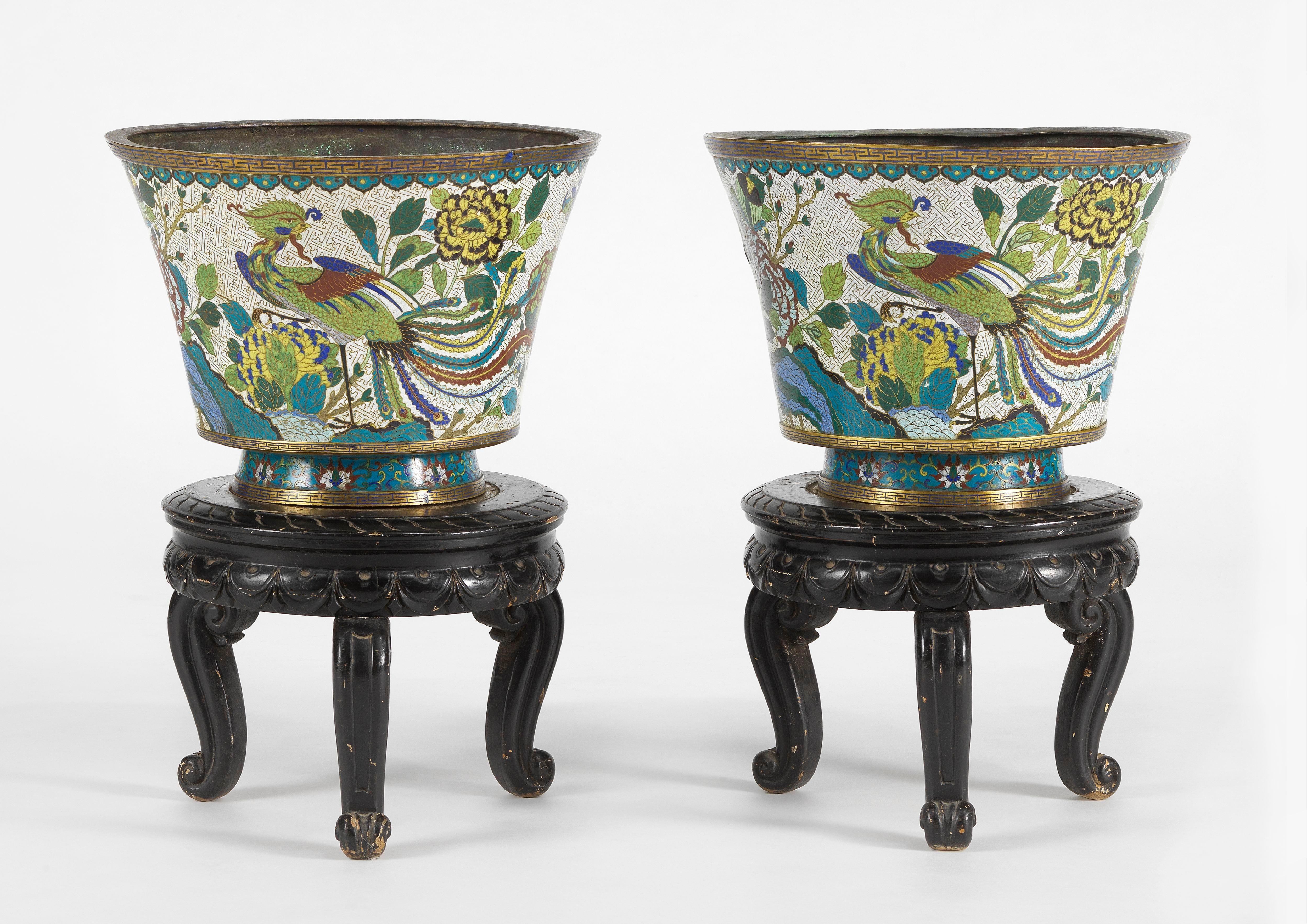 Cuivre et émaux cloisonnés à motifs de pivoines et phénix sur fond blanc, H 28,5 cm et D 40 cm. Provenance: Château de Racconigi près de Turin, numéro d'inventaire sous la base: 18697 R et P.P.R 566 et 567; étiquettes du château datées 1933 et portant ces derniers numéros.. Provenance: Collection Prince et Princesse de Savoie. Provenienza: Collezione Principe e Principessa di Savoia
