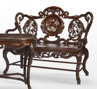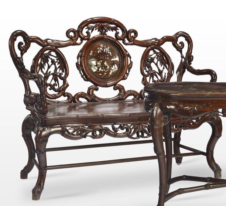 Bois naturel sculpté et incrusté de nacre, fin XIXe s, L 126 cm