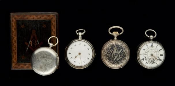 376. Lot de quatre montres de poche décorées de symboles maçonniques,...