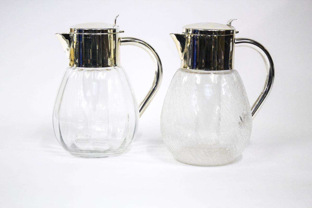 Verre givré et godronné, anse et col en métal argenté, H 28 cm