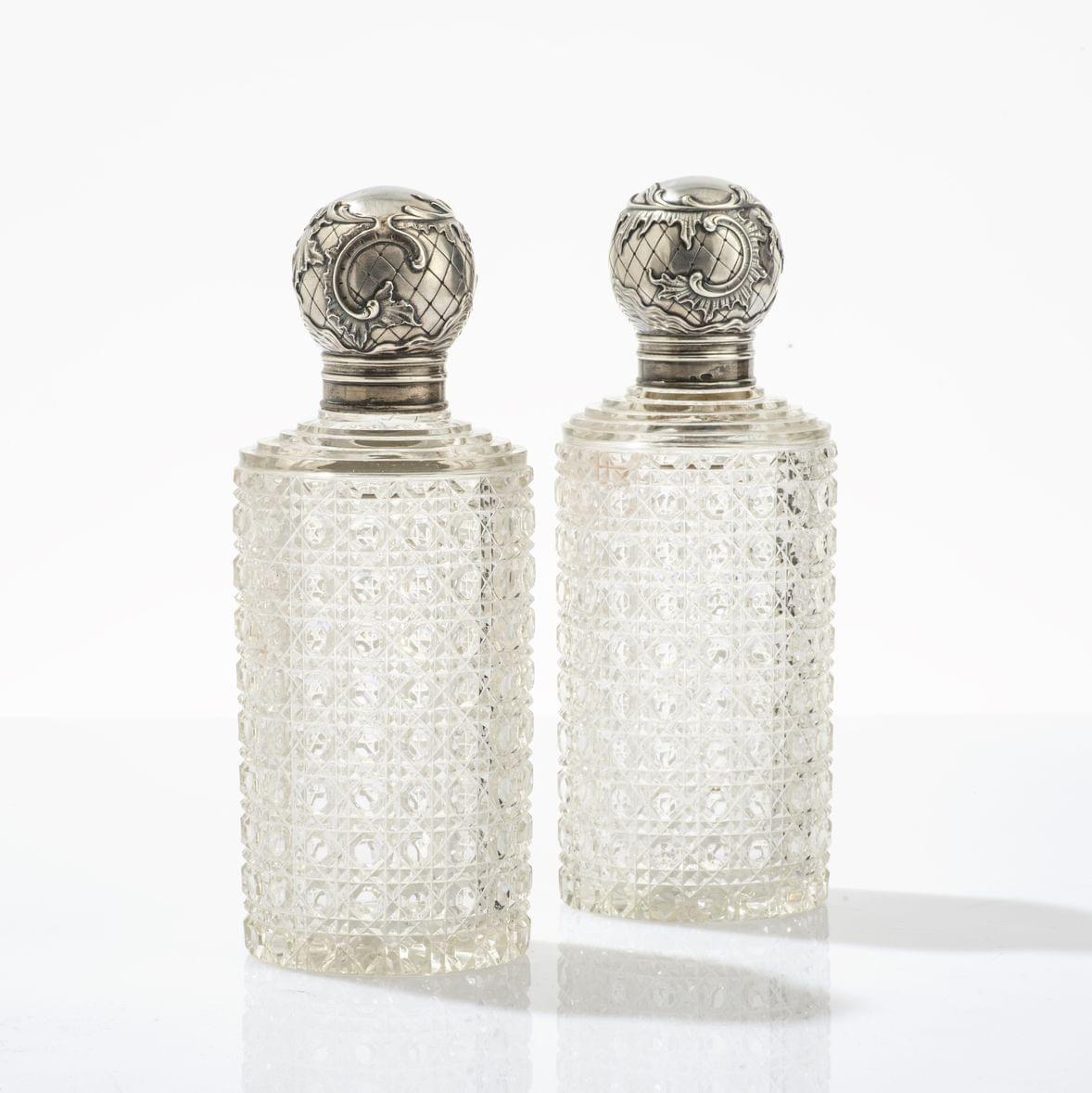 90. Paire de saupoudroirs, deux bouteilles et un flacon en verre gra...