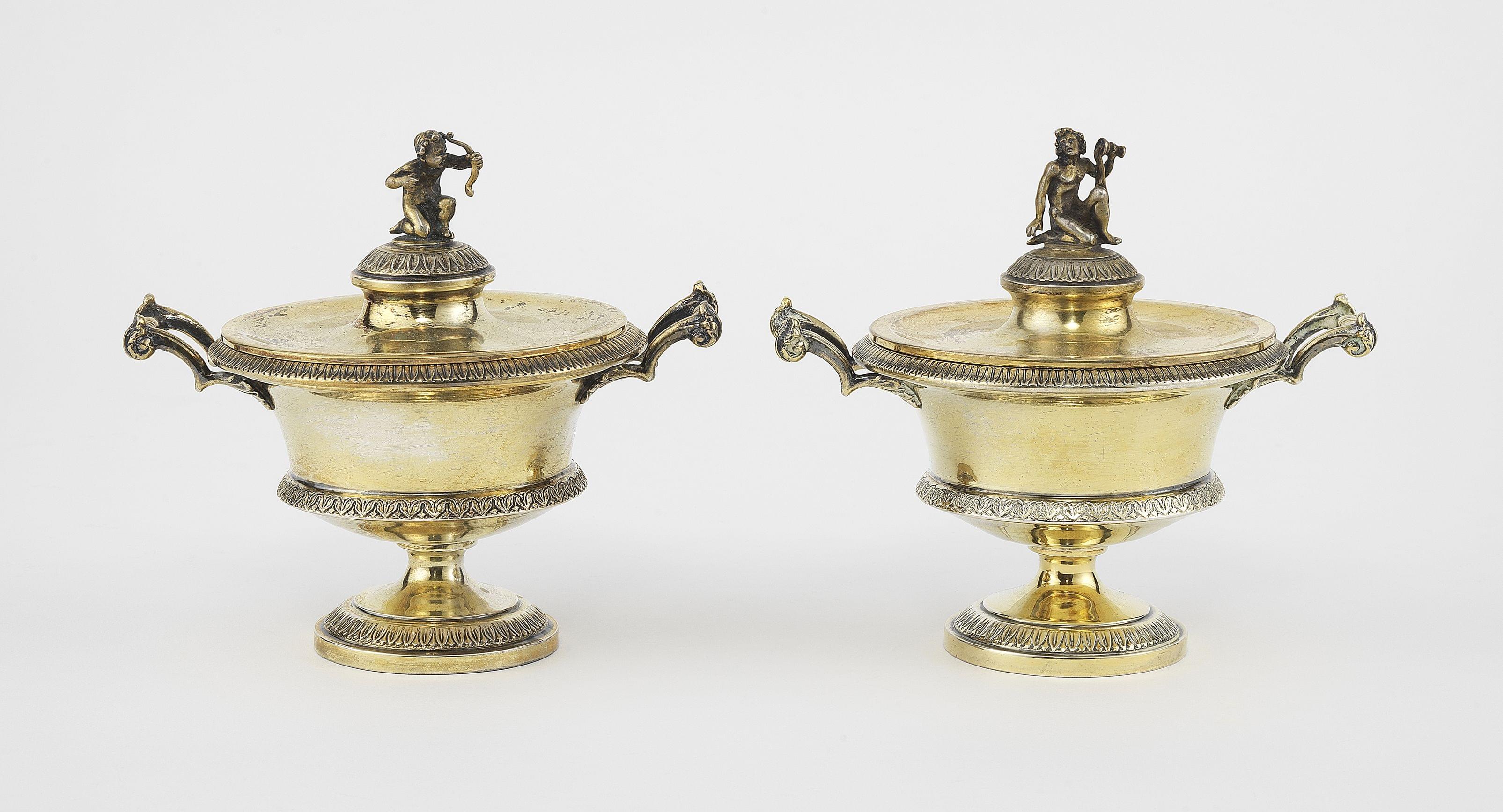 3767. Paire de cassolettes néoclassiques à prise Amour et Bacchus