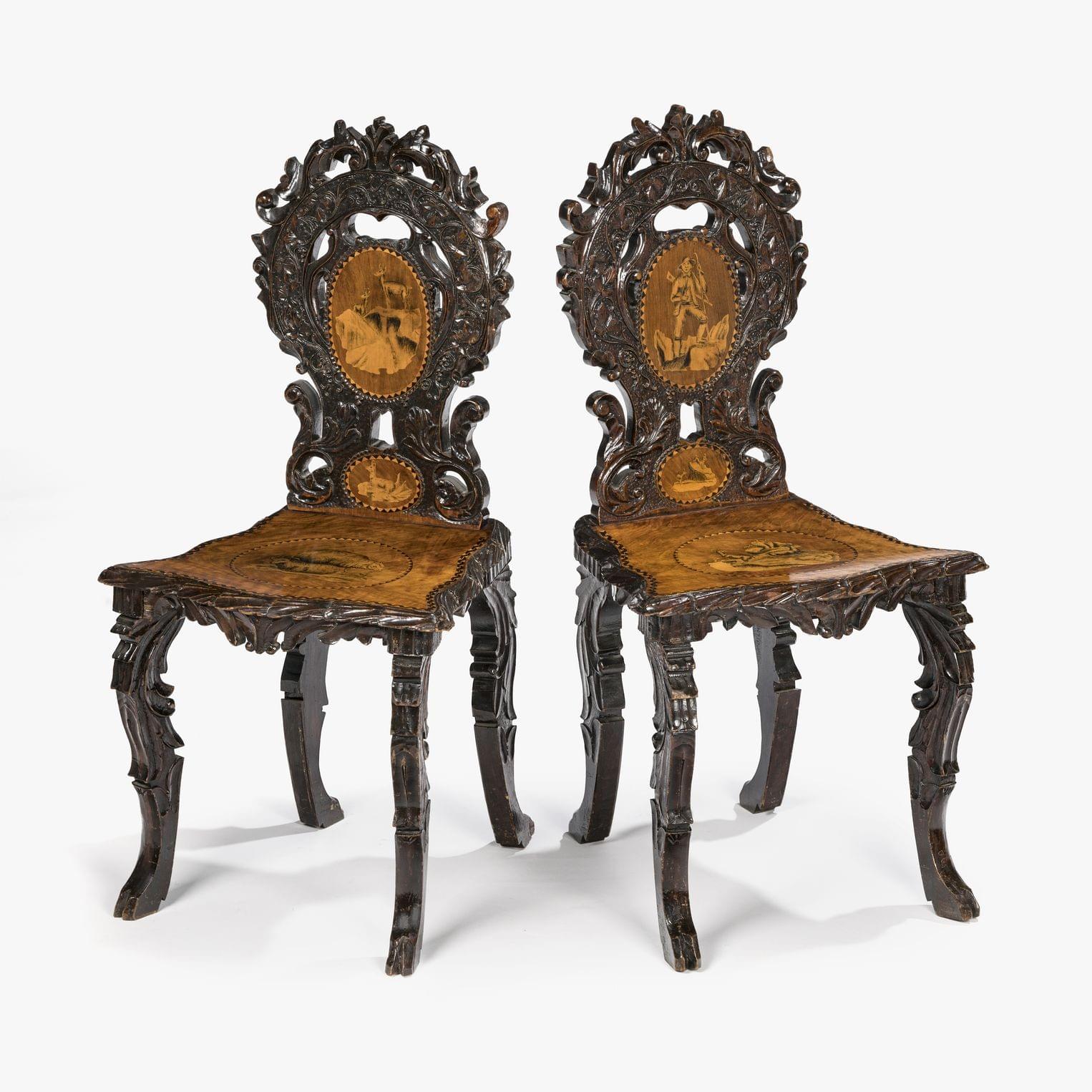 Bois naturel sculpté de feuillages et à décor gravé de scènes de chasse et de bouquetins