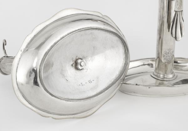 1. Paire de flambeaux à décor repoussé de larges fleurs et acanthes