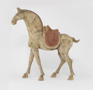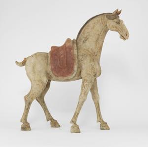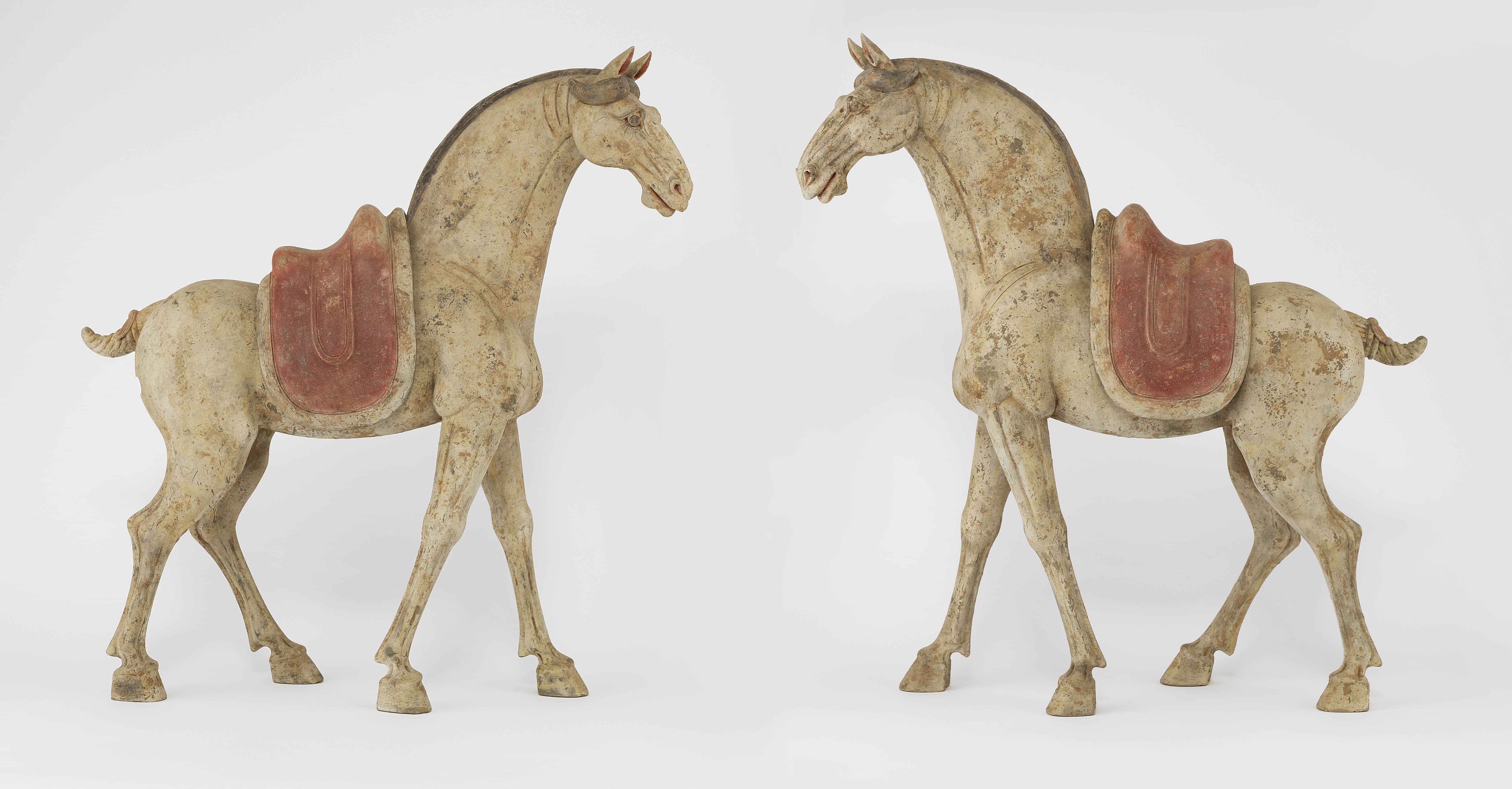 Figurés en position de marche, selle amovible, terre cuite, H 71,5 cm. Deux certificats de thermoluminescence Archeolabs TL no CH-08-25-01-11-TL et CH-08-25-01-12-TL en date du 30 juin 2008 accompagnent cette pièce, confirmant une date de réalisation située entre 1000 et 1500 ans.