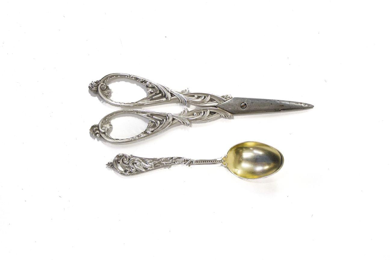3402. Paire de ciseaux et cuillère à motif ajouré de roseaux et chimères