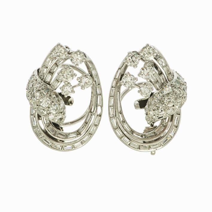 423. Paire de clips d'oreilles circulaires sertis de diamants taille brillant et taille baguette