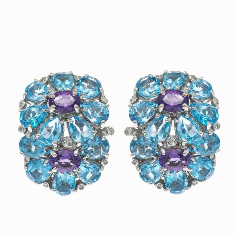 264. Paire de clips d'oreilles double fleurs sertis d'améthystes, de topazes bleues et de diamants