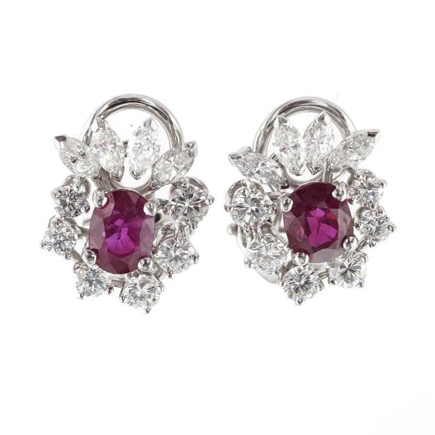 291. Paire de clips d'oreilles sertis de rubis taille ovale (env. 1.4 ct) entourés de diamants taille brillant et taille navette (env. 1 ct)