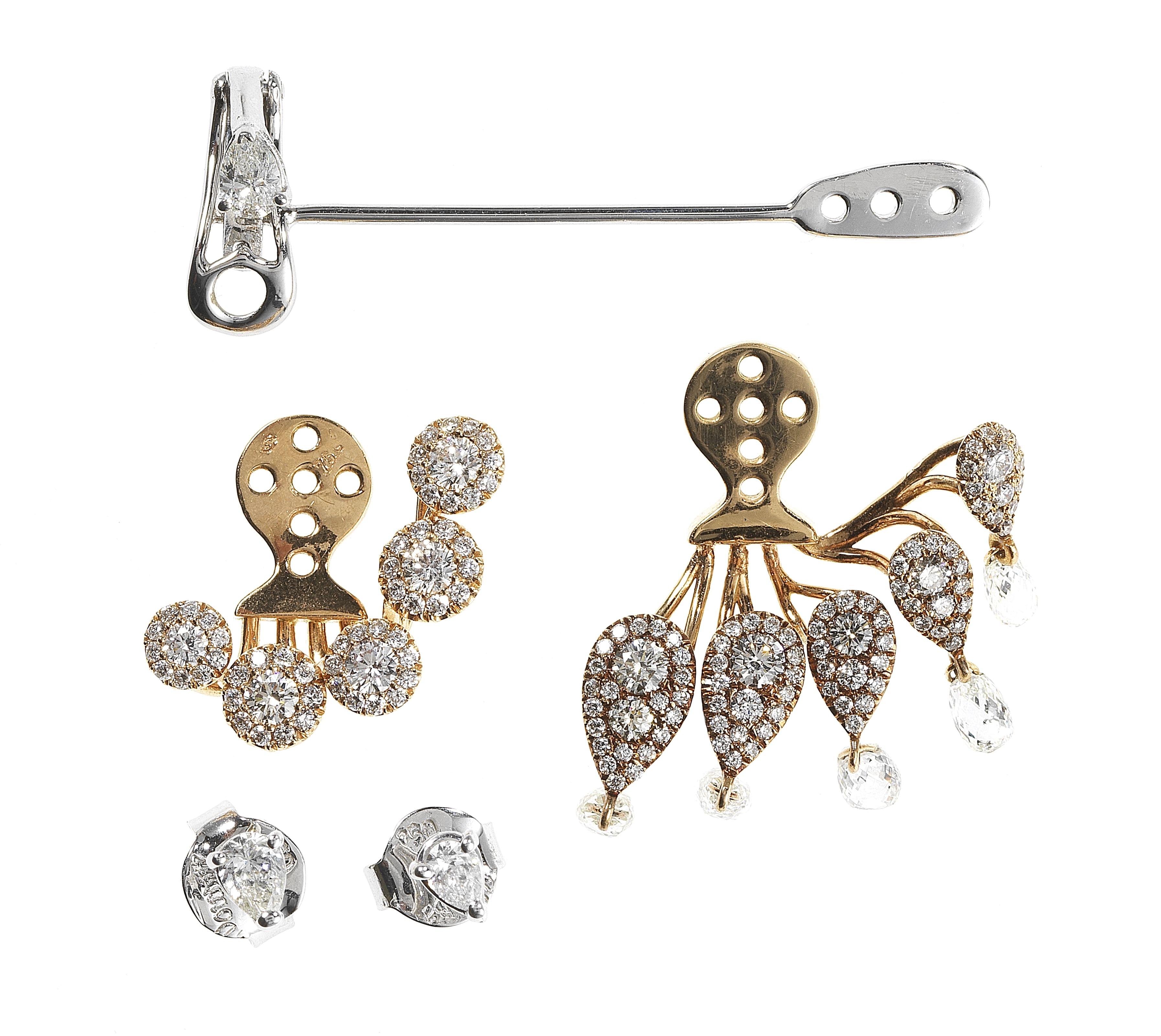 Or gris 750, 3 g. On joint deux accessoires pour oreille gauche sertis de diamants. Or rose 750, 6 g