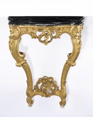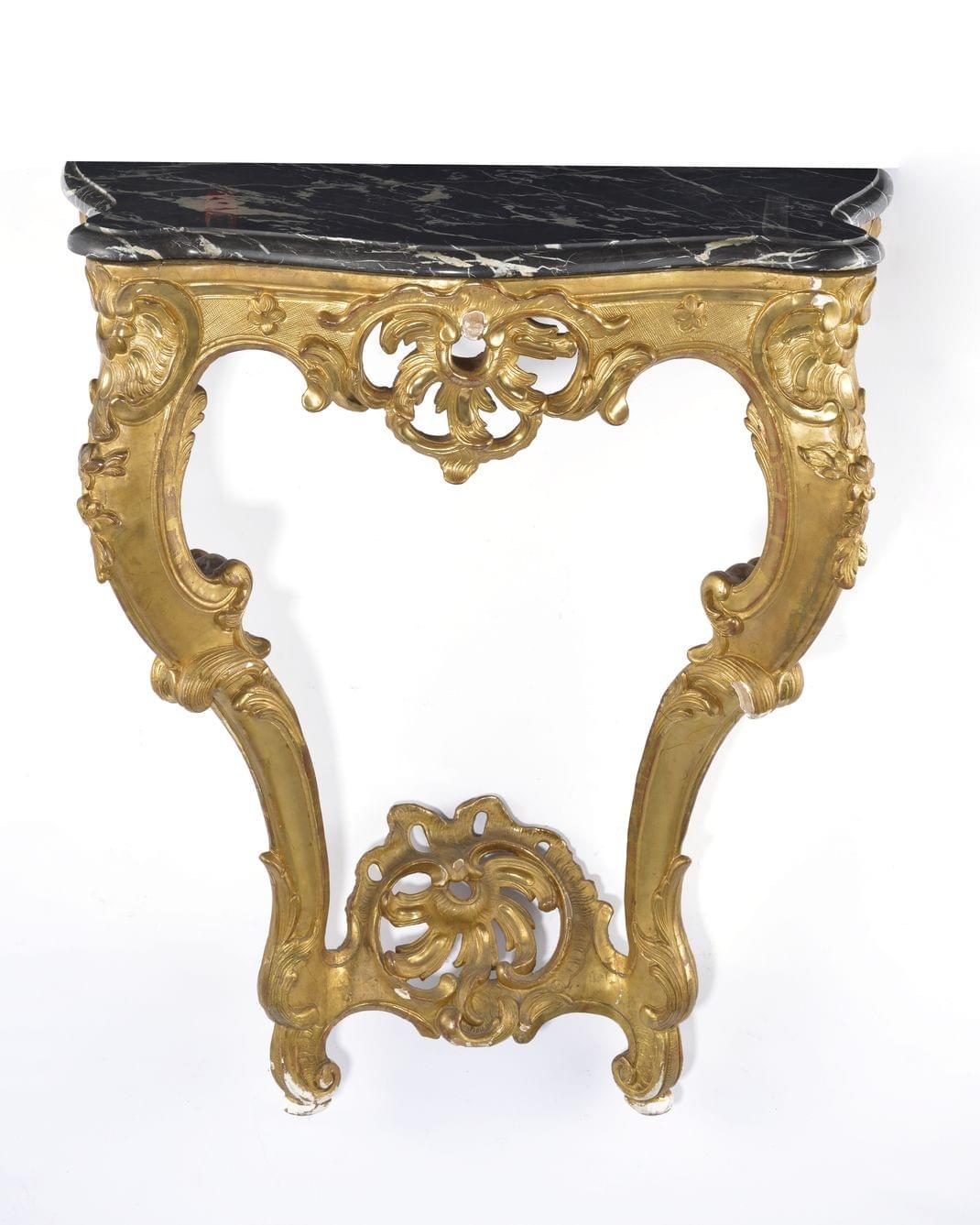 Bois sculpté doré et ajouré, marbre noir veiné blanc, probablement Berne, XVIIIe s, 84x75x39 cm