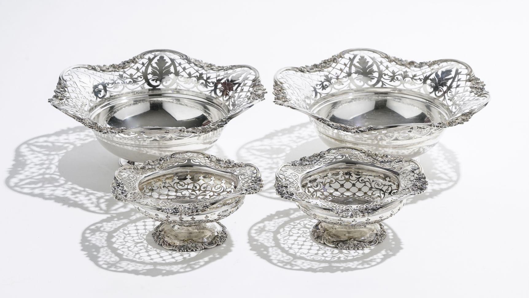 410. Paire de coupes et paire de coupelles d'époque George V à bordure mouvementée ornée de fleurs et ajourée de palmettes dans un treillis
