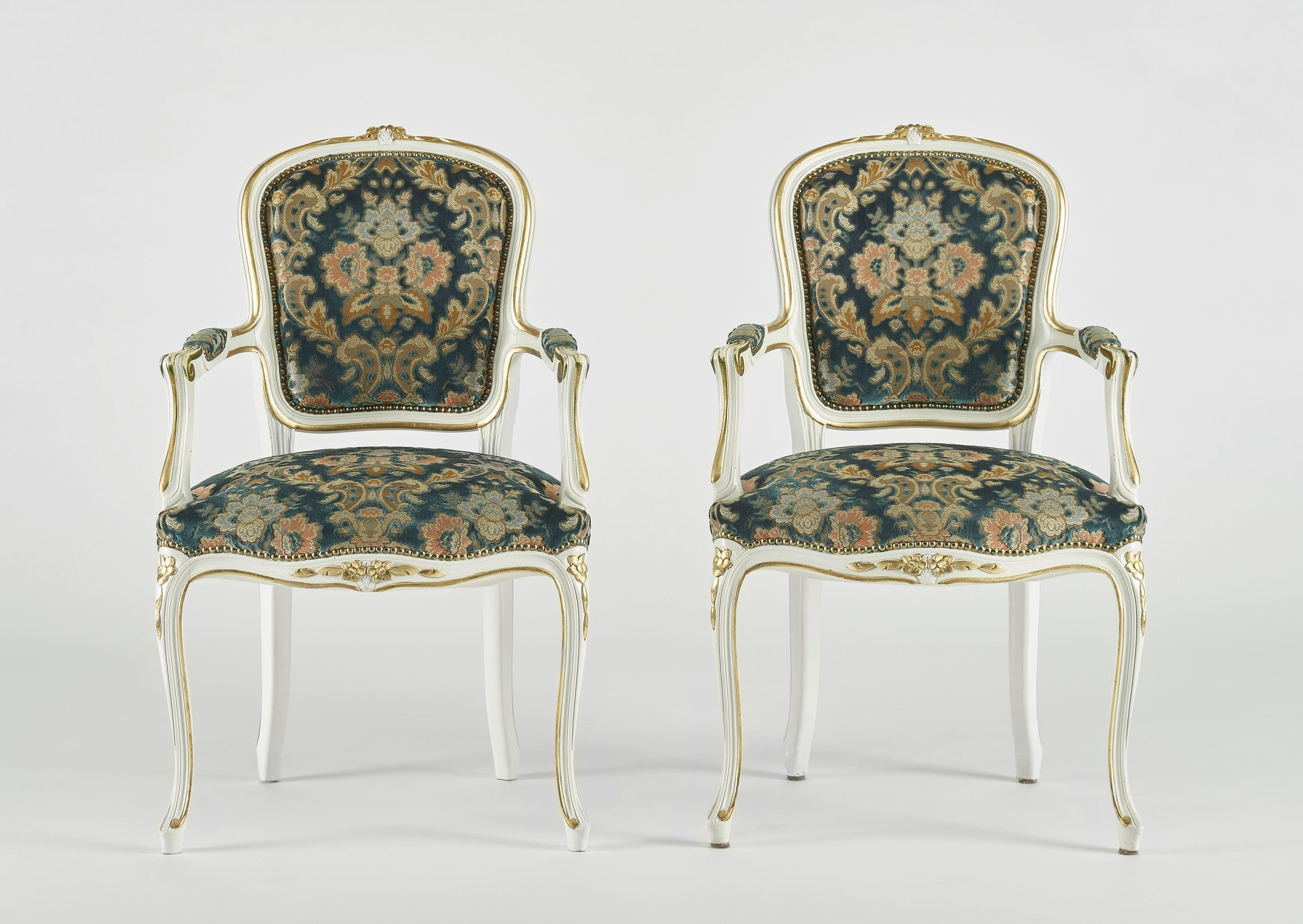 Bois laqué blanc et or, garniture de velours frappé bleu